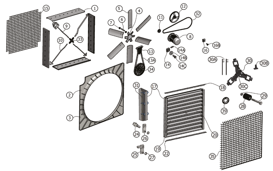 - einem Schutzgitter gemäß der Norm UNI EN ISO 138573 (auf Anfrage und nur bei einer Installation des Ventilators in einer Höhe unter 2,5 [m] vom Boden)